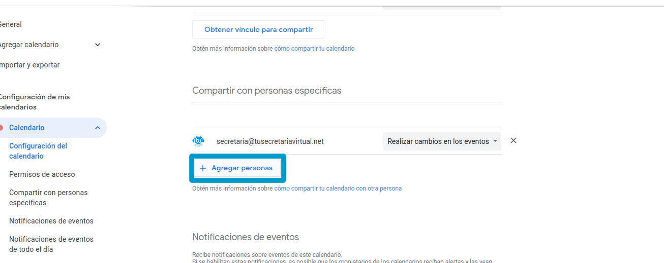 4. Buscar la sección compartir con personas especificas y agregar el correo [email protected] con el  permiso para realizar cambios en los eventos.