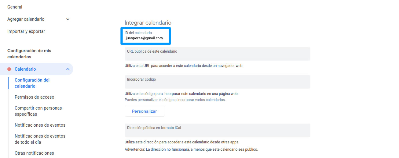 5. Bajar a la sección Integrar calendario y Copiar el ID del calendario.